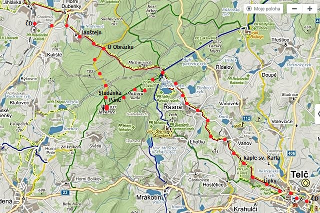 Trasa: Jihlávka – Chadimův mlýn – Žižkův kámen ČTZ – Janštejn – U Obrázku ŽTZ – Studánka Páně – Javořice ZTZ – Míchova skála – Velký Pařezitý rybník ČTZ – Řásná – Lipky – Telč – Telč nádraží – 23 km + 5 km po Telči a Jihlavě