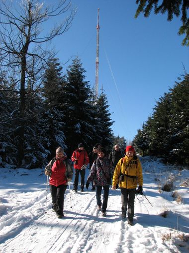 Na vrcholové plošině pod vysílačem bylo zářivě až slavnostně – hloubku modré oblohy zdůrazňoval 164 metrů vysoký ocelový stožár s laminátovým nástavcem, postavený v roce 1989 (první, 55 metrů vysoký vysílač, vznikl na Javořici roku 1961). Panovala tu úplně jiná atmosféra nežli na Silvestra 2014, kdy jsme na nejvyšší horu Vysočiny (837 m) vystoupili naposledy.