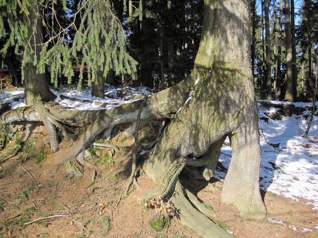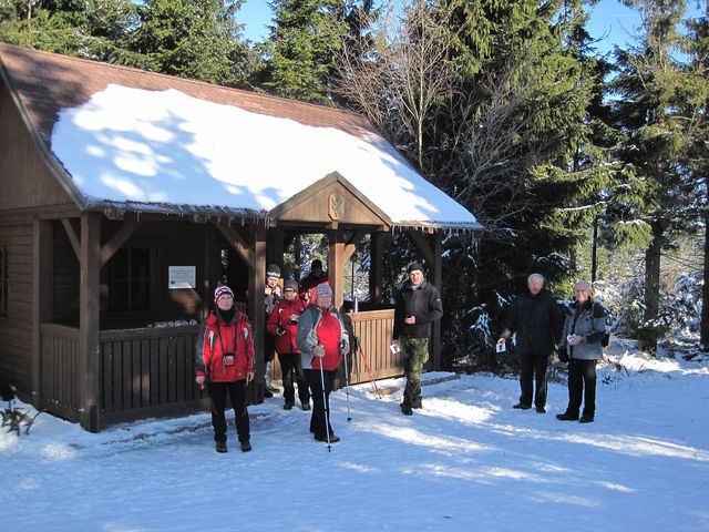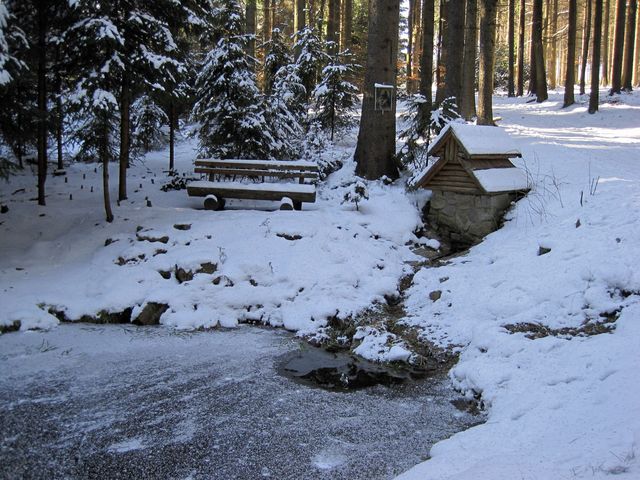 Z Javořice jsme sestupovali po zeleně značené cestě, vedle níž je odpočívadlo se studánkou – přírodní svatyně je v zimě spíše útočištěm pro duši nežli tělo: