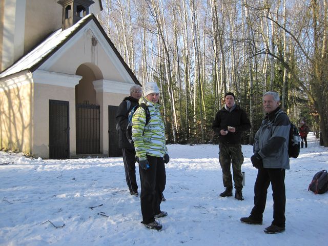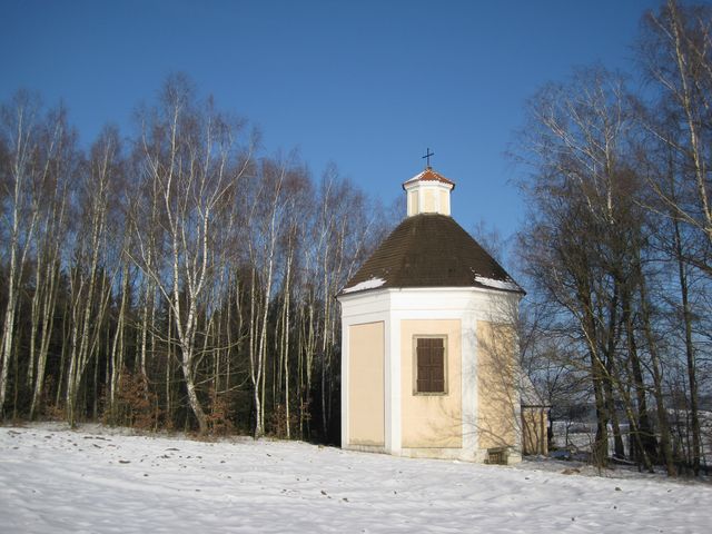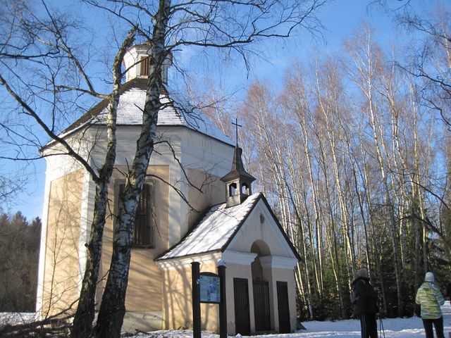 tradiční zastavení patřilo osmiboké kapli sv. Karla Boromejského z roku 1663 – o staré i novější historii poutní kaple jsem podrobně psala ve článku Přechod Jihlavských vrchů 2012, tak jen připomenu, že ji vybudovala hraběnka Františka Slavatová jako poděkování za záchranu života syna Karla Jáchyma (spadl do vlčí jámy), kterým nakonec stejně vymřel v roce 1712 rod Slavatů. A v době poměrně nedávné (1961) zde tragicky skonal mladý kněz Vladimír Koukal – tři měsíce po vysvěcení ho při modlitbě zasáhl před oltářem blesk…
