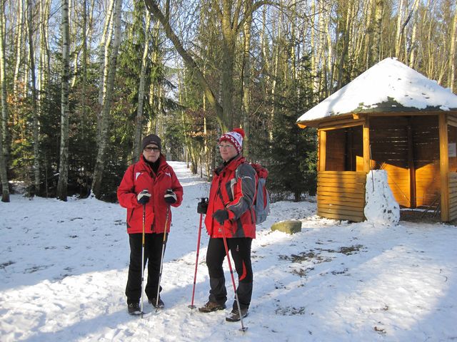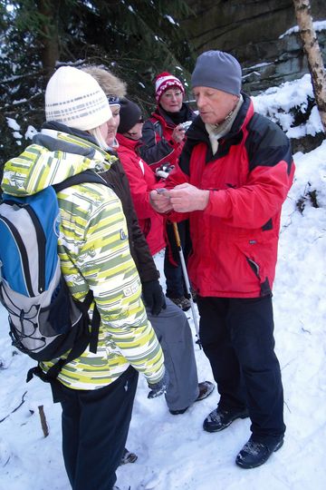 Sníh, kterého nebylo dost na běžkování, byl zmrzlý, takže jsme se nebořili a cesty v bezvětrném zimním dni využívali k lehké společenské konverzaci, která však nebránila bedlivému pozorování okolí. V Janštejně jsme se od Míly Bradové dozvěděli, že projektantem koupaliště, otevřeného v roce 1986, byl její tchán Ing. František Brada (stejně jako na Okrouhlíku u Jihlavy).