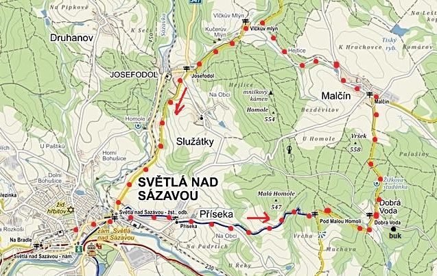 Trasa vycházky: Světlá nad Sázavou ČD, MTZ – Příseka – Pod Malou Homolí ŽTZ – Dobrá Voda – Žižkův buk – Žižkova studánka – Malčín – neznačenou cestou k Vlčkovu mlýnu ŽTZ – Josefodol – Světlá nad Sázavou = 15 km