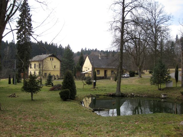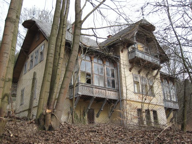 Z osady jsme pokračovali stále po žluté značce, na severním okraji vsi jsme míjeli ve stráni nádherně umístěnou vilu, značně zdevastovanou, ale od místních jsme se dozvěděli, že současná majitelka už začala s venkovními úpravami, takže na budovu snad taky jednou dojde.