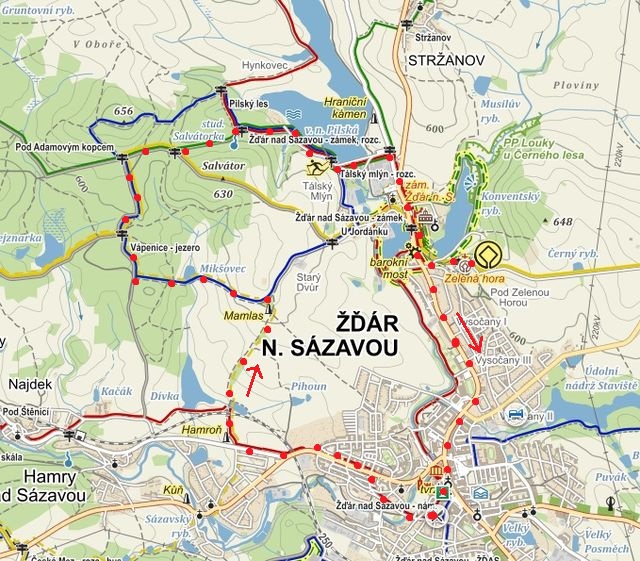 Trasa: náměstí Žďár ČTZ – Hamroň ŽTZ – Mamlas MTZ – rybník Mikšovec – jezírko Vápenice – Pod Adamovým kopcem ZTZ – studánka Salvátorka – Tálský mlýn – Pilská nádrž ČTZ – cukrárna 🙂 – zámek, prohlídka baziliky a nádvoří – poutní kostel na Zelené hoře – Žďár náměstí (věž kostela sv. Prokopa, muzeum v Moučkově domě) – sokolovna = nejméně 17 km 🙂