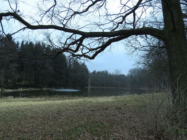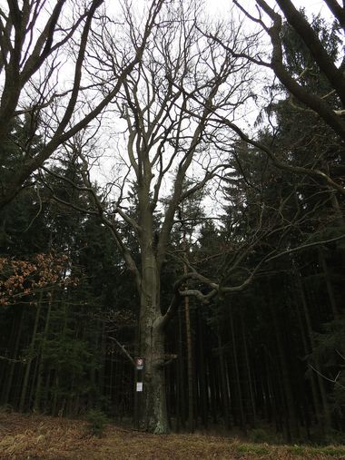 Zbývalo dojít do cíle – sestupovali jsme z lesů do volné krajiny, v okolí Třeště charakterizované četnými alejemi a kaskádami rybníčků – mnohokrát jsem je zmiňovala ve článcích na našich stránkách. Ze závěrečného úseku vycházky zařadím jen obrázek památného stromu uváděného pod názvem Buk nad myslivnou – výška 40 metrů, obvod kmene 370 centimetrů, stáří přes dvě stě let,