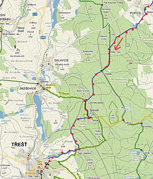 Trasa: Popice MTZ – Dílky – U Obrázku – U Černého pařezu – Špičák – Třešť-hájovna – kolem rybníčků do Třeště = 11 km