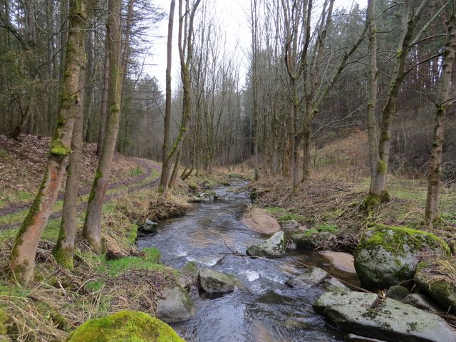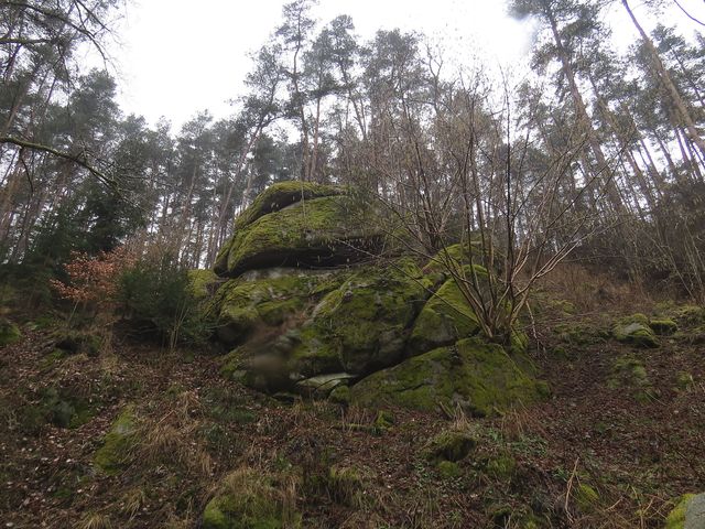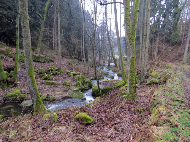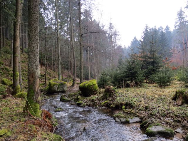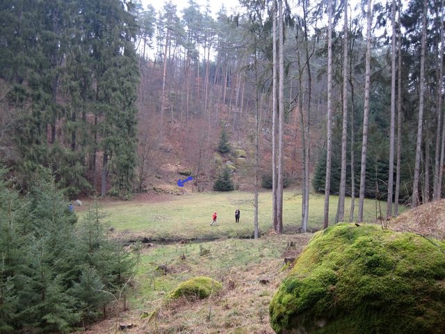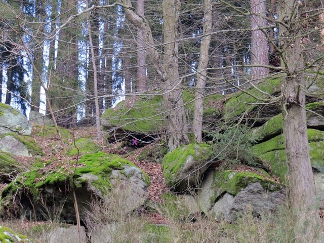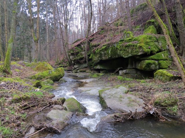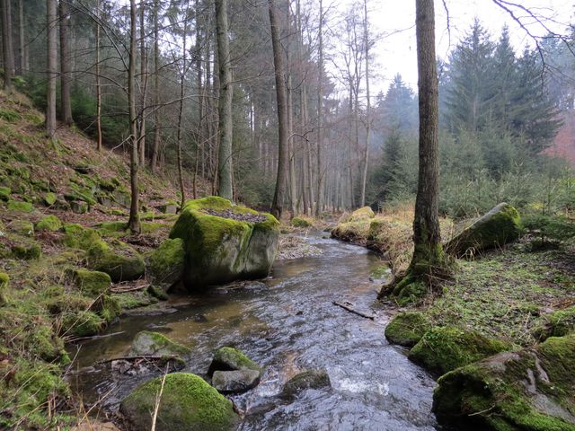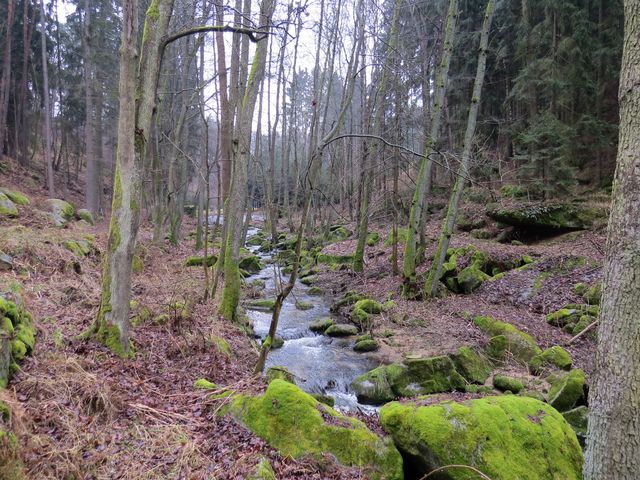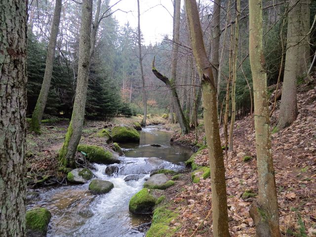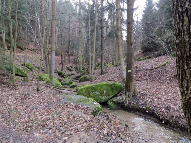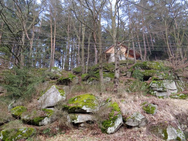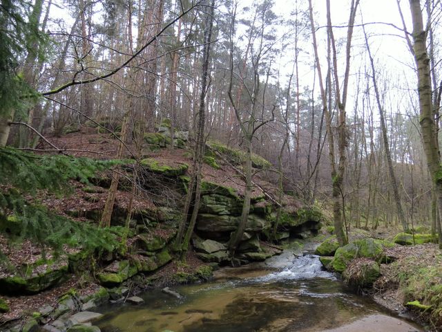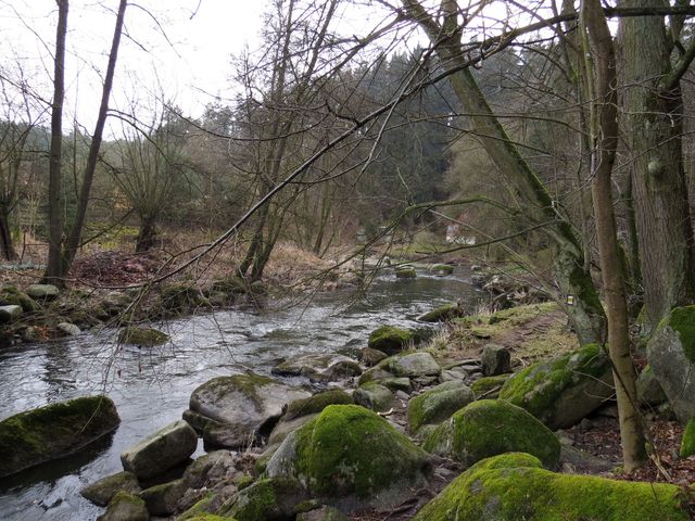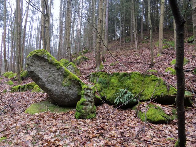 Údolíčko vpravo od silnice, kterým spěchá Polomina k Oslavě, se postupně zužuje, aby po necelých dvou kilometrech balvanitý les ustoupil a udělal místo louce u Oslavy.
