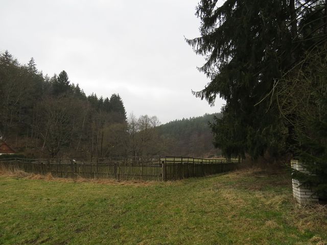 Na kraji lesa u louky je několik starých chat, ale zanedlouho cesta končí u plotu!