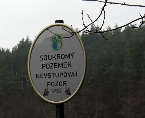 Před Panským mlýnem jsme zahnuli vlevo na silničku k bývalému Stejskalovu mlýnu, po chviličce se objevila Oslava. Podle mínění mnohých je řeka v těchto místech pod hradem Dub nejkrásnější… Blížíme se ke splavu a najednou cesta končí! Pevná závora, nepřehlédnutelné výstrahy! Majitel Holomek zahradil jedinou přístupovou cestu, je prý jeho. Nevím, proč mi najednou neodbytně zvoní v hlavě latinské rčení… Doma jsem pak na netu zjistila, že mnoho lidí, zvláště cyklistů, kteří zůstali před závorou, použilo v komentářích výraz nomen omen.