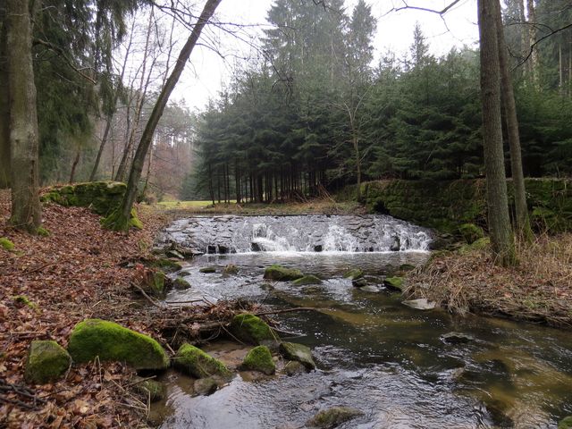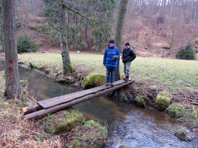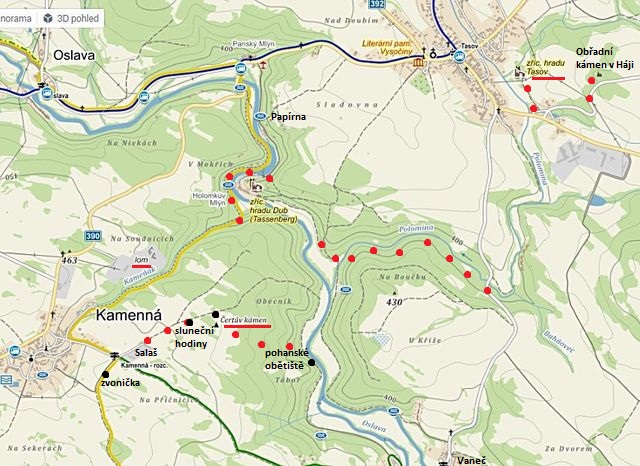 Šli jsme žlutě značenou turistickou trasou, která sleduje Oslavu od Velkého Meziříčí a opouští ji u Holomkova mlýna, aby podél potoka Kameňáku přivedla poutníky do Kamenné a přes Pyšel až do Studence na nádraží.