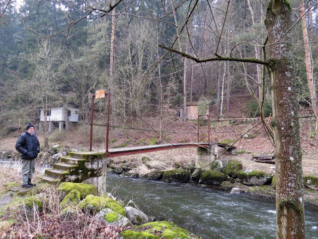 K chatám na protějším břehu je umožněn jen uzoučký průchod vedle zadrátovaného pozemku – podél splavu, ke kterému chodíval Jakub Deml na ryby, přicházíme k chatrné lávce vedoucí na druhý břeh.