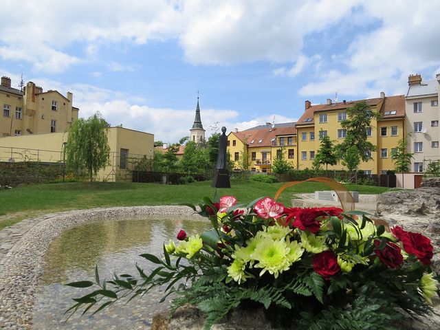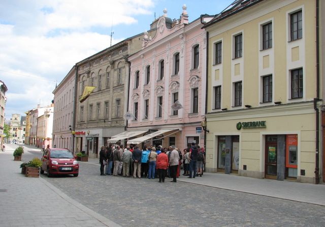 Další krátká zastávka byla na horním Masarykově náměstí před domem, kde má v současnosti také sídlo banka – v roce 1838 se tu v rodině sekretáře vrchního zemského soudu Franze Prokopa narodil syn August, pozdější úspěšný architekt a vynikající znalec dějin umění.