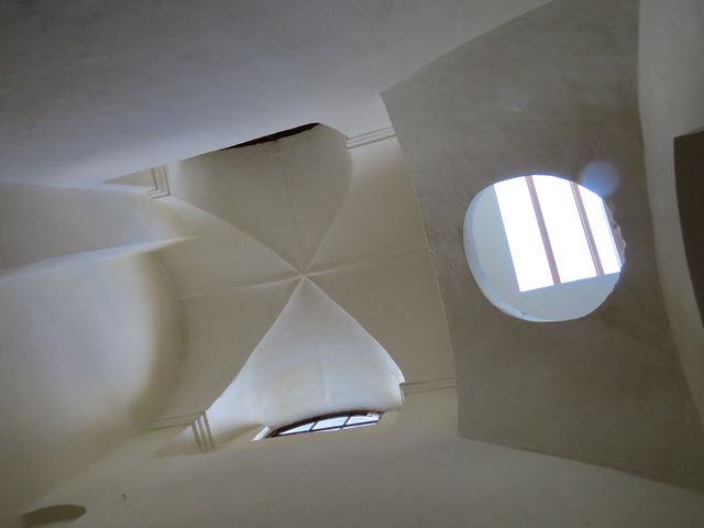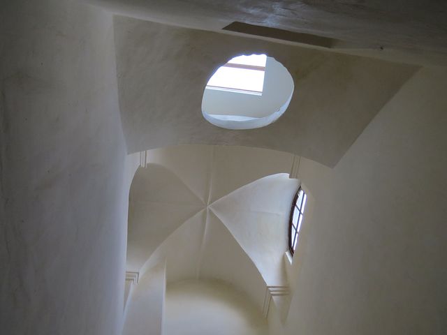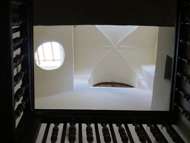 Schodištěm jsme vystoupili do horní patrové síně – čtvercová centrální část domu sahá do druhého patra a je přímo osvětlena denním světlem, které přichází z kryté světlíkové nástavby vystupující nad střechy okolních domů.