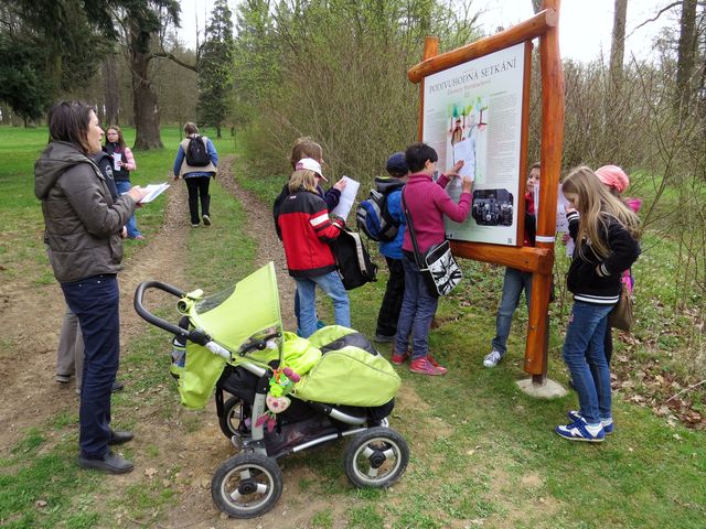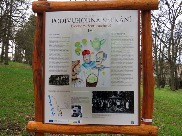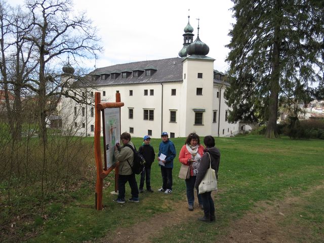 – na cedulích jsme si přečetli o stromech (mnohé z nich sázel učitel Alois Josef Pátek), lesích, zvěři i studánkách a pomalu se vraceli zpět k zámku. Nevím, s jakým časovým rozpětím pro projití a poznání okruhu počítají tvůrci stezky, my, M+M+M, jsme čtení textů věnovali skoro tři hodiny – a máme pocit, že nebyly ztracené. 🙂