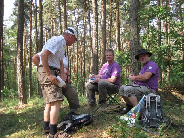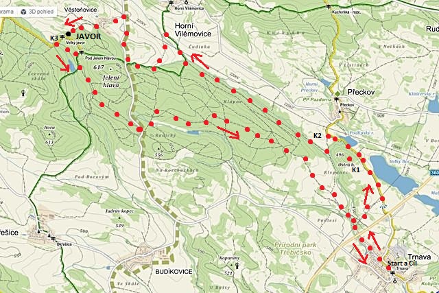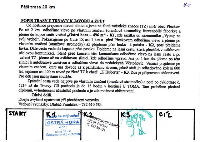 Od pořadatelů jsme dostali přesný popis trasy – většinou jsme putovali po lesních cestách, nezařazených v síti značených turistických tras, které pečliví trnavští turisté opatřili na stromech značkami ve tvaru oranžových smrčků – zcela spolehlivě nás vedly krajinou, místy dokonce pěšinkami dokonale vysečenými a vyklučenými křovinořezem – žasli jsme nad tak dokonalou přípravou pochodu…