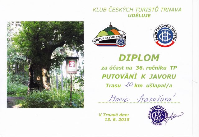 Cestou do cíle jsme se opět na mnoha místech přesvědčili, že značení pro poutníky bylo dokonalé a bezpečně nás dovedlo na terasu hostince, kde jsme z rukou předsedy KČT Trnava Františka Dlabáče převzali diplom za účast.