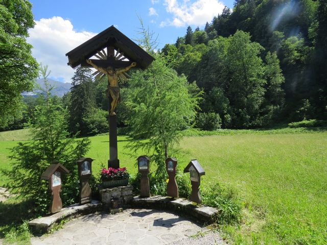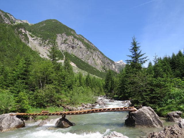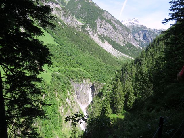 Poslední možnost občerstvení se nabízí v chatě Untere Roßgumpenalm (1330 m) – kousek od ní nás při přechodu přes lávku z mohutných dřevěných fošen zasáhla jemná sprška vody donesené větrem z dalšího vodopádu – potok Roßgumpenbach stékající ze strmých svahů Allgäuských Alp se s velkým hřmotem vlévá do Höhenbachu na dně údolí.