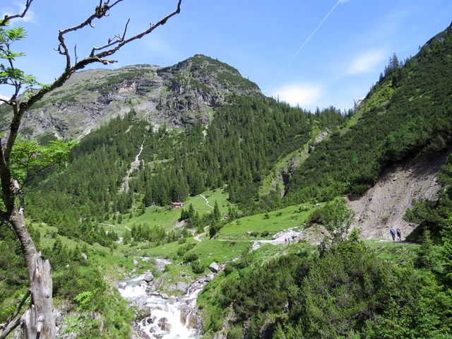 Většina rakouských výletníků mířila ke kavárně Uta, odkud se okruhem vraceli do Holzgau po spodní cestě podél potoka, do kterého padají z výšky vodní spousty – my jsme měli v plánu stoupat údolím vzhůru do sedla Mädelejoch.