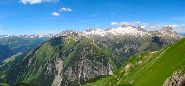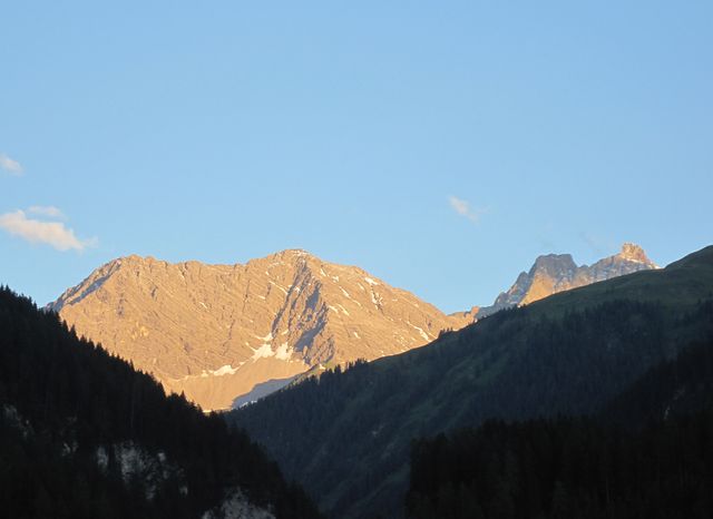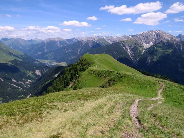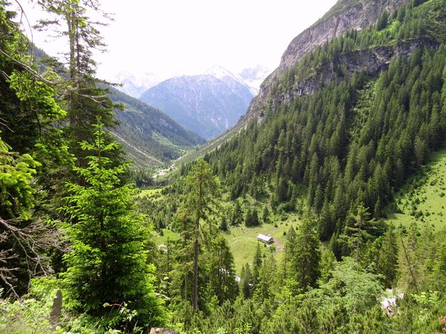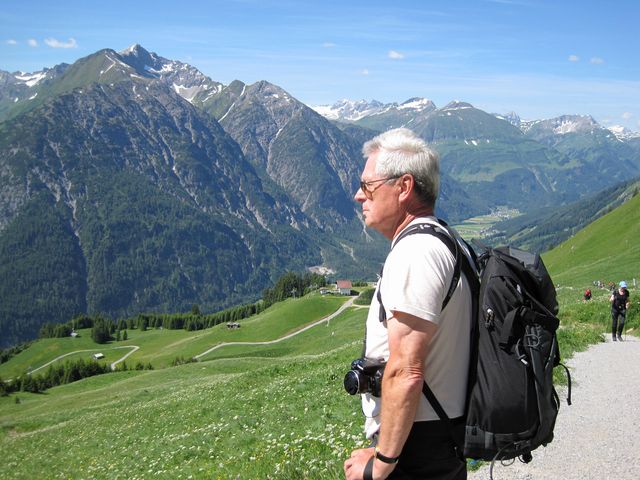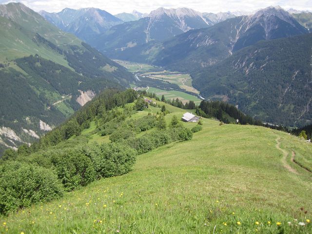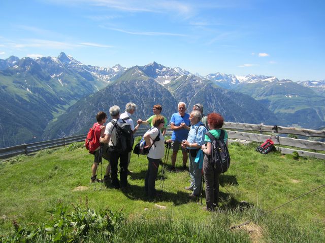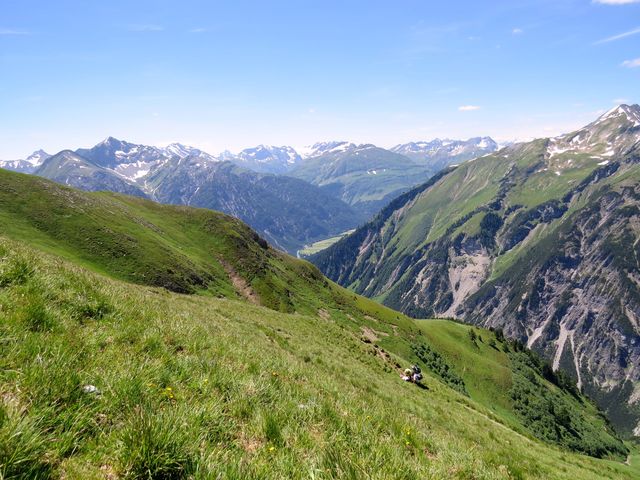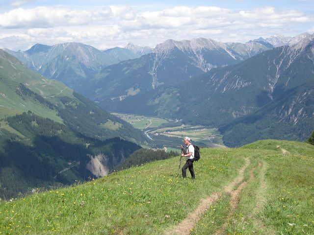 Kruhový rozhled a dobrá viditelnost byly prémií za usilovnost – v hloubce Höhenbachtalu poblíž Holzgau jsme uviděli světlou nitku závěsného mostu a obdivovali vrcholky nad hlubokým údolím, kterým jsme vystoupili v pondělí na Mädelejoch.