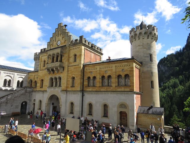 A skutečně – drobné přepršky nás provázely při výstupu na vrch nad strží Pöllat – tam Ludvík II. Bavorský (1845–1886) nechal postavit pohádkový zámek a nazval ho Neuschwanstein (Nový Labutí Kámen). Stavba trvala 17 let, během nichž byl zároveň stavěn rekreační zámek Linderhof (Lipový Dvůr) a na ostrově v největším německém jezeře vznikala obdoba Versailles, Herrenchiemsee (zámek jsme navštívili v roce 2009). Ke všem výdajům královské pokladny na finančně nákladné stavby je nutné přičíst financování operní a divadelní činnosti hudebního skladatele Richarda Wagnera, Ludvíkova oblíbence. Ludvík II. byl znalec a mecenáš všech druhů umění, obdivovatel antiky a starogermánských ság – jen to vládnutí a vedení válek ho příliš nebavilo – není divu, že čím byla královská pokladna prázdnější a král k záležitostem Bavorska laxnější, tím nespokojenější byli ministři zodpovědní za chod země. Každopádně měl Ludvík II. jasnou představu o prioritách, a mocí královského majestátu je prosazoval – okolí vnímalo jeho chování jako velmi podivné, a když se zcela odstřihl od veřejnosti (dokonce nesnášel ve své blízkosti ani služebnictvo), situace se přiostřila natolik, že byl prohlášen za duševně chorého a přinucen abdikovat. Byl zatčen, převezen na zámek Schloßberg u Mnichova a tři dny poté byli Ludvík a jeho osobní lékař nalezeni utonulí ve Starnberském jezeře.