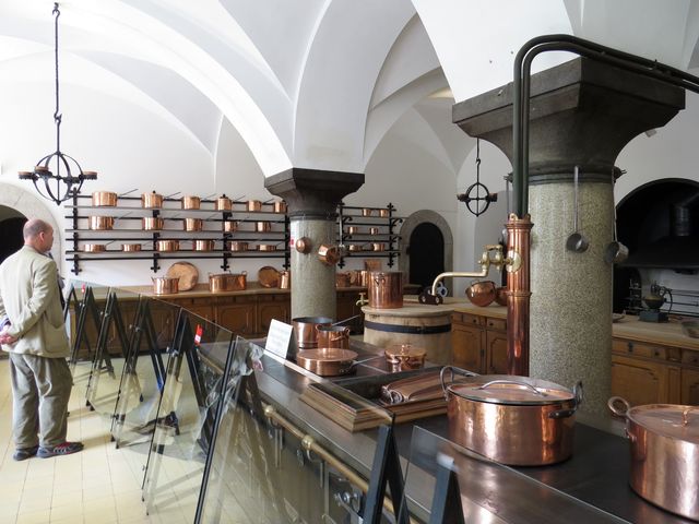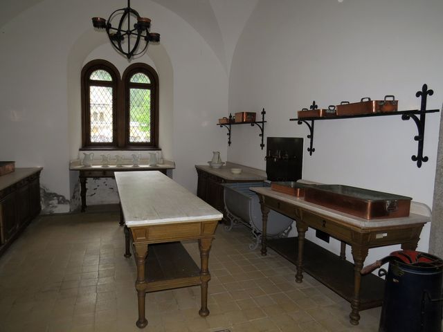 Depresivní a krvavé středověké příběhy i starogermánské symboly, kterými bylo vyzdobeno každé místečko v interiéru, byly šperkovány zlatem a drahokamy, jejich vážnost podporována královskou modří, vyřezávaným těžkým nábytkem a sochami hrdinů z děl Richarda Wagnera – mezi vším se skvěli oblíbení ptáci krále Ludvíka II. – pávi a labutě ve všech podobách a provedeních – shodli jsme se na tom, že duševně labilní Ludvík se musel v takovém prostředí dostávat přes všechnu nádheru do těžkých depresí… Nejnormálnější a pozitivní náboj měla střízlivá a vkusná kuchyně (a taky se tam dalo volně fotit 🙂 ):