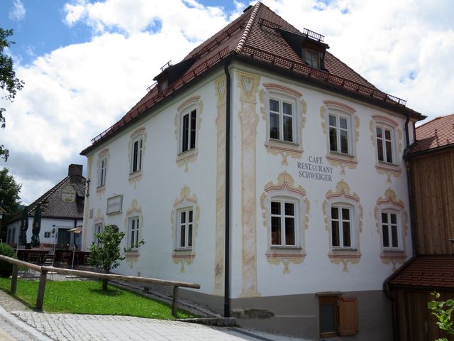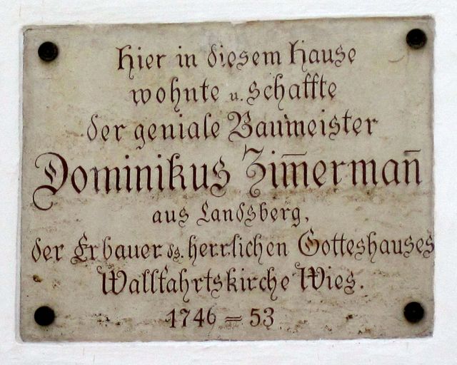 Dominikus Zimmermann (1685–1766) si postavil vedle kostela dům, ve kterém žil do konce života – pamětní deska na fasádě připomíná geniálního mistra.