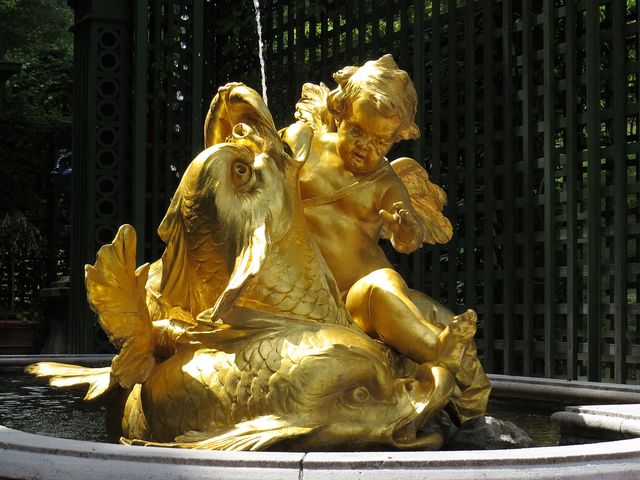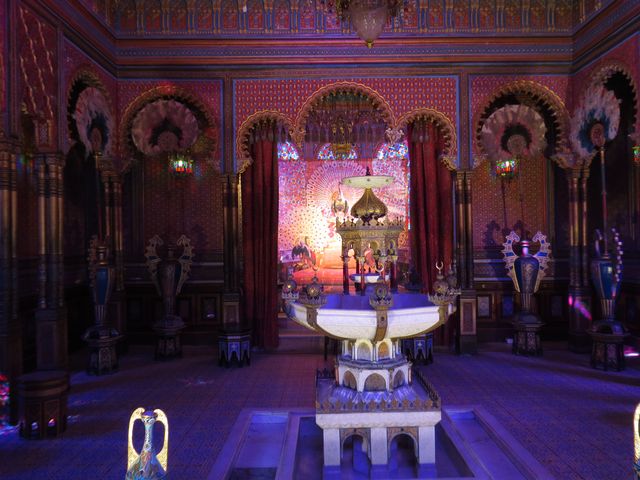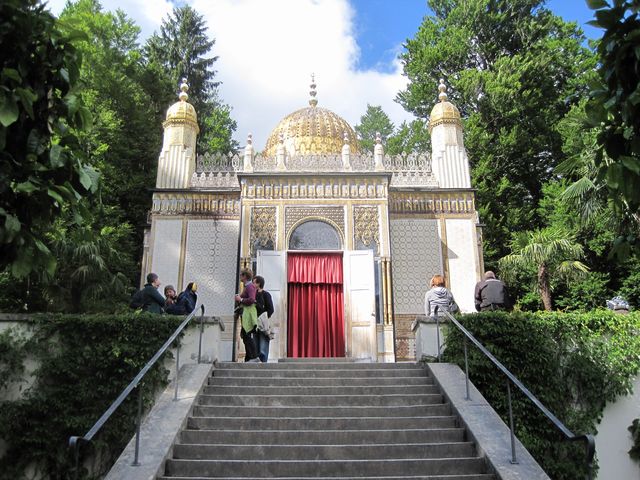 Z dalších staveb v parku nám zbyl čas jen na zacházku k Maurskému kiosku – pavilon koupil král Ludvík na Mezinárodním veletrhu v Paříži v roce 1867 – nábytek vykládaný perletí, orientální koberce a vázy, pohovky a filigránová výzdoba se spoustou zlata dobře zapadají do koncepce odpočinkového areálu v Ludvíkově stylu – a zvenčí je stavba půvabná.