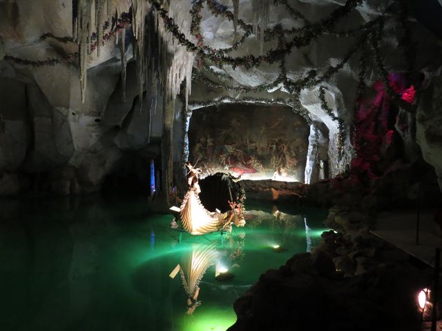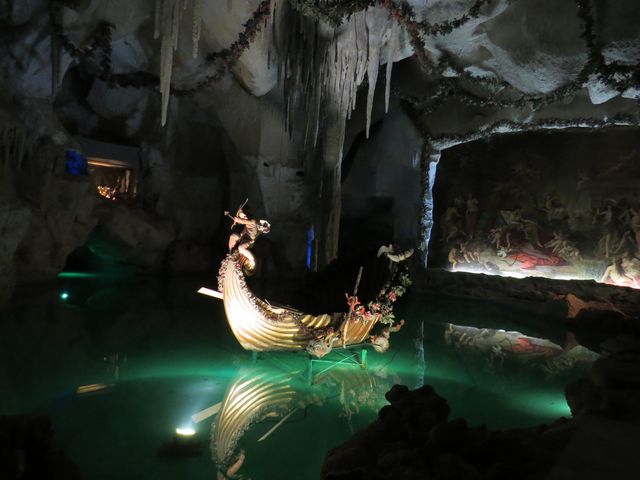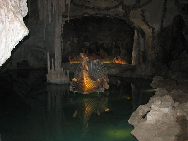 Patnáct metrů vysoká a několik desítek metrů dlouhá jeskyně s vodopádem byla vlastně divadlem pro jednoho diváka – král tu při měnícím se barevném osvětlení jezdil na pozlaceném člunu ve tvaru mušle, krmil labutě, opájel se Wagnerovou hudbou – mnohdy převlečen za Tristana, Lohengrina či jiné postavy z oper svého milovaného autora…