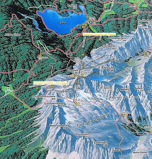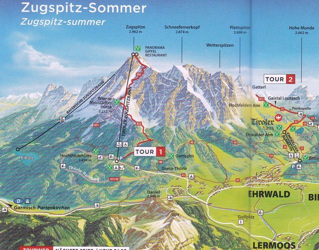 Protože Zugspitze je hraniční hora, výjezd lanovkou je možný z Ehrwaldu, což je tyrolská strana, z Bavorska se jezdí od jezera Eibsee.