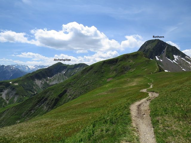 Pohled na nedaleký Rothorn (2 393 m) byl úžasný a přitažlivý – červená břidlice pod vrcholkem činí horu výjimečnou – bývali bychom na ni rádi vystoupili, ale příkré travnaté srázy byly nad naše síly. Sestoupili jsme do sedla Rothornjoch (2 158 m), šli část cesty po strmých svazích nad údolím a pokorně se vrátili do sedla, ze kterého vycházela Lechtalská panoramatická cesta s cílem v Elbigenalp – to byl skvělý program zbytku dnešního dne.