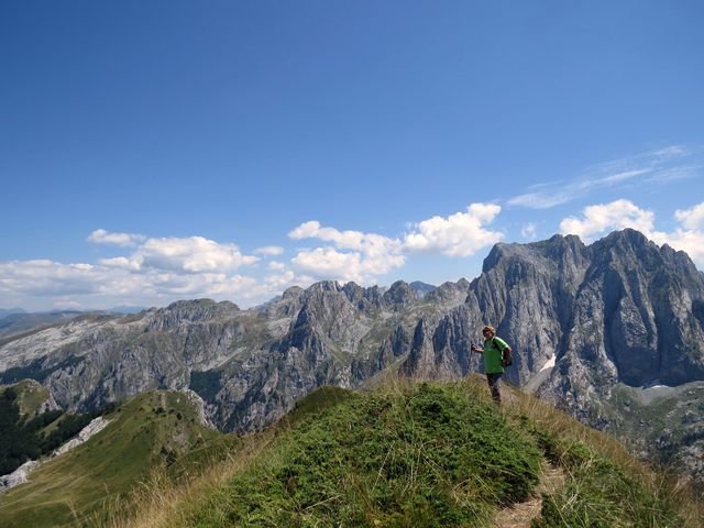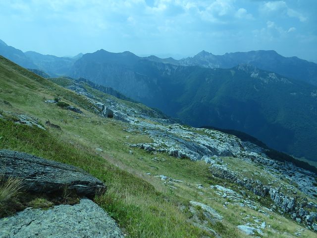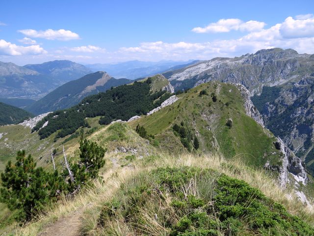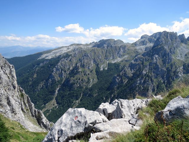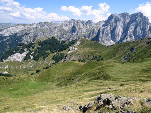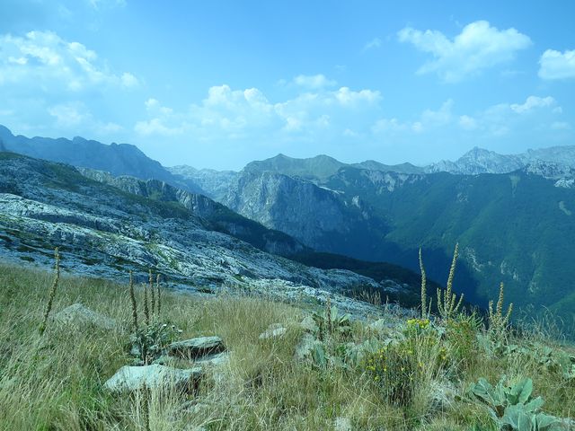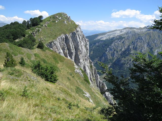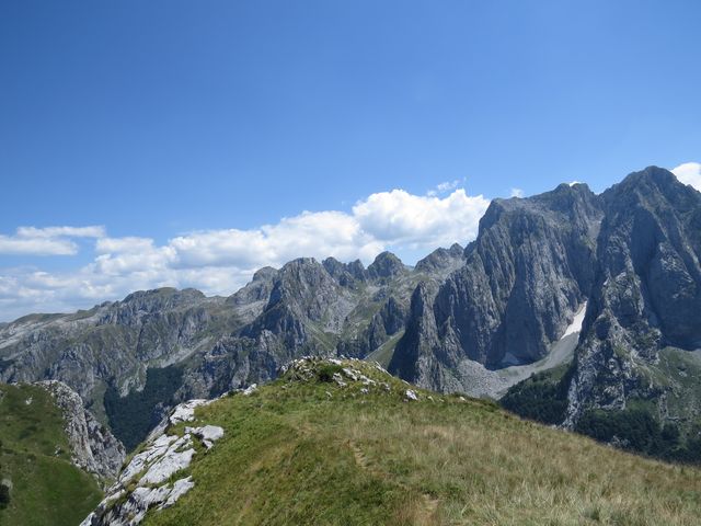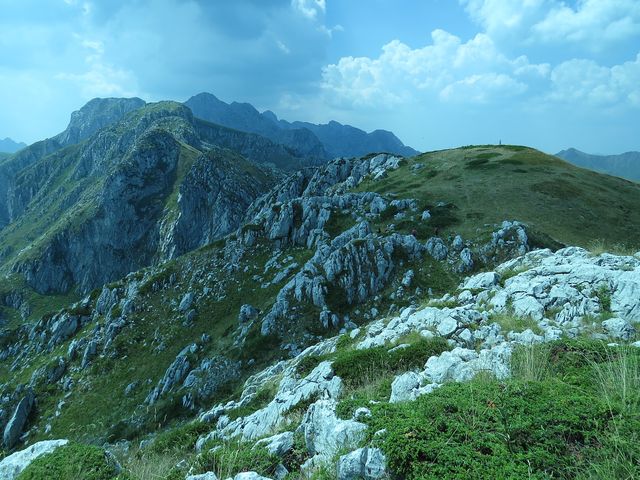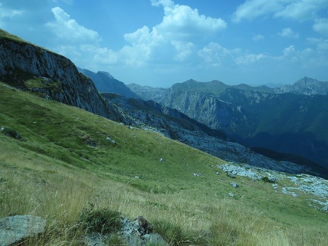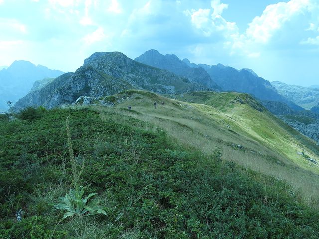 Úchvatné, dva a půl tisícové štíty Karanfili jsme teď měli po pravé ruce – tento členitý hřeben se táhne z černohorského území na albánské a po stranách obou úpatí vytváří překrásná údolí Ropojana a Grbaje.
