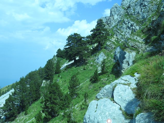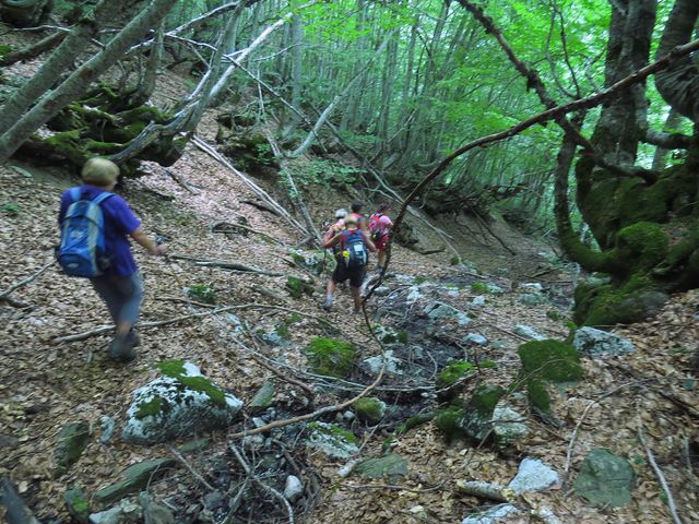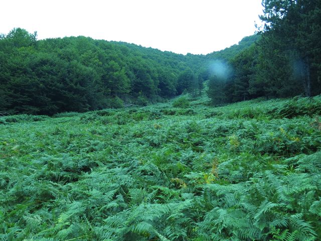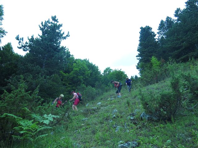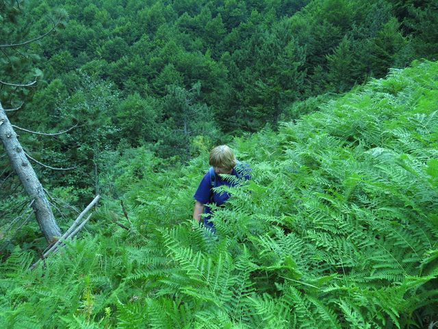 Při sestupu jsme viděli, že v údolí nad Gusinje řádí bouřka, na hřeben si ale netroufla. Podle Martinova popisu jsme sešli bez problémů po travnatých svazích až k napajedlu při hranici lesa na svazích Vezírovy brady. Věděli jsme, že se musíme držet spíše vlevo – značení tady možná kdysi bylo, ale… Vydali jsme se po stezce, která skončila v křoví a kapradí, zkusili jsme dvě jiné se stejným výsledkem… 🙁 Možnost jít strží od napajedla dolů jsme odmítli (chyba!) a vydali se traverzem přes příkrý svah porostlý kapradím, protože zpočátku se zdálo, že by snad… Nějakou dobu jsme bojovali s masožravou Adélou převtělenou do kapradí a zjistili, že tudy cesta sice nevede, ale bude výhodnější jít dál – před námi se rýsovaly koruny stromů – tam přece musí být líp (chyba!).