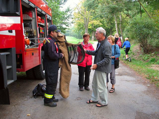 Na začátku nádherné Vlkovské aleje jsme se setkali s první atrakcí – za volant přistaveného hasičského auta se mohli posadit kluci – můžu potvrdit, že byli štěstím bez sebe. My jsme si se zájmem prohlídli oblek, který používají hasiči při manipulaci se včelími roji – vstřícný mluvčí přidal několik historek, takže i pro dospělé bylo zastavení zajímavé.