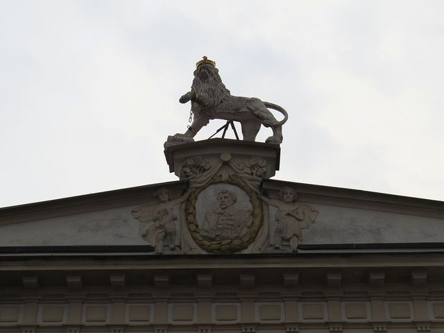 Na nejvýraznějším štukovém reliéfu je zpodobněn Hus na hranici, medailony po stranách znázorňují Komenského a Chelčického, pod sochou českého lva se zpřetrhanými okovy na předních tlapách je portrét K. H. Borovského – z výčtu je vidět, že všechny užité motivy rozehrávají struny národní.