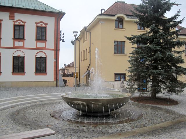 Dominantou je samozřejmě část před Starou radnicí, kde nás nejdříve zaujala kašna Pěti pramenů – ze 48 trysek po jejím obvodu vytéká voda a nad hladinou mísy z mrákotínské žuly tančí a skotačí středový gejzír symbolicky smíchaný z vody pěti řek, které na Žďársku pramení.
