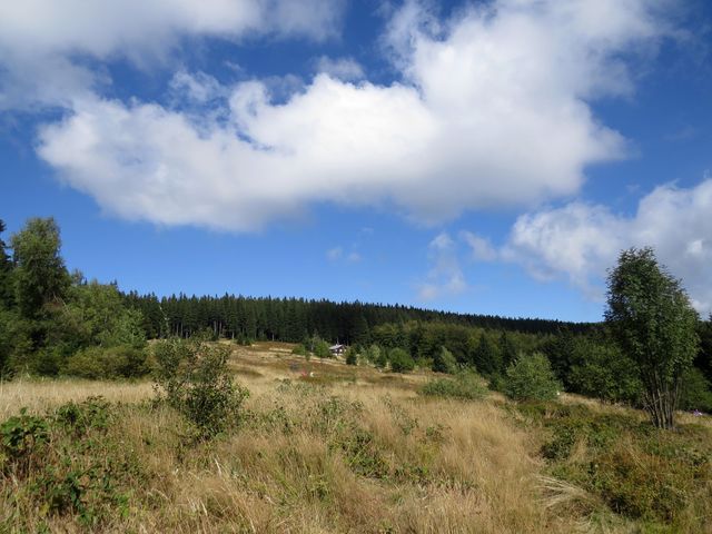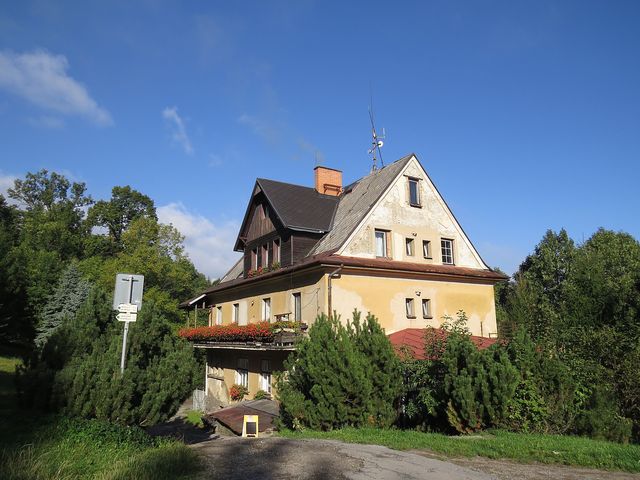 V sedle Pod Ostrým jsme odbočili vpravo na žlutě značenou cestu a asi po dvou kilometrech došli na rozlehlou paseku k turistické chatě, která slavila 80. narozeniny.