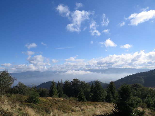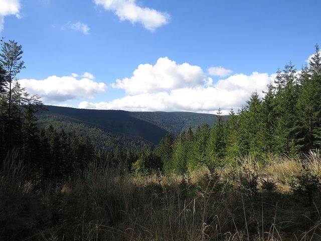 Stoupali jsme po obslužné cestě, převážně lesem, ale naskytly se i příležitosti k výhledům na hraniční hory.