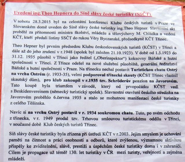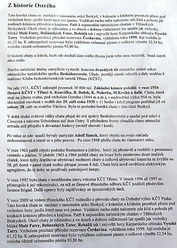 Nájemce chaty vystavil na panelech množství historických fotografií a jiných dokumentů, týkajících se staveb na Ostrém i lidí, kteří se zasloužili o rozvoj turistiky na Třinecku. Mirek ofotil pasáže s podstatnými informacemi: