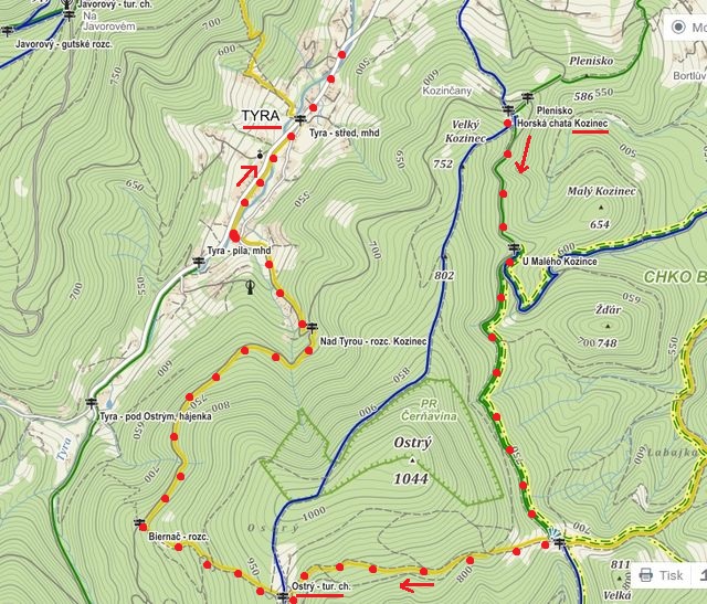Při návratu do údolí jsme se stále drželi žluté značky, která nás přes rozcestí Biernač dovedla až do Tyry.