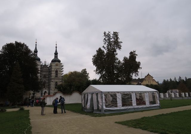 My jsme využili toho, že ve stanu, který postavili na nádvoří kvůli pochodu Eurorando humpolečtí turisté, můžeme zastihnout a pozdravit několik našich přátel, a odebrali jsme se tam.