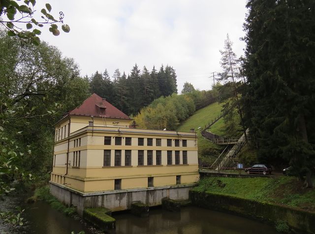 Doslova za humny rekreačního areálu je první vodní elektrárna, ve které jsme měli domluvenou exkurzi. (Více o vodních dílech v tomto kraji je ve článcích Značení pěší trasy z Humpolce k hydroelektrárně u Želivky a Krajem Šimona kouzelníka.