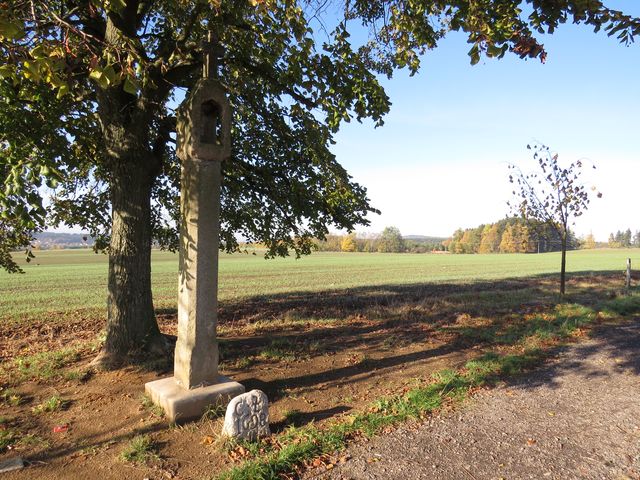 Neznačenou cestou jsme se sluncem mírně stoupali k „Mamlasovi“, jedné z prvních soch Michala Olšiaka roztroušených v krajině kolem Žďáru. Ale ani v dřívějších dobách nechyběly pod širým nebem artefakty – většinou církevního charakteru či pamětní kameny – pokud se zachovaly a jsou opravené, je na ně hezký pohled…