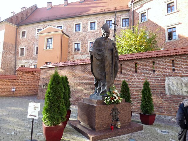 Jsme ovšem v Polsku, proto na zdejším nádvoří nemůže chybět ani socha papeže sv. Jana Pavla II. (1920–2005, v dubnu 2014 kanonizován):