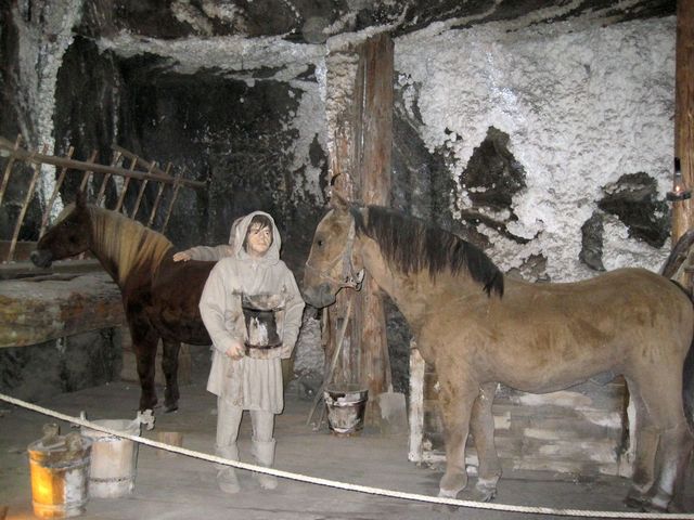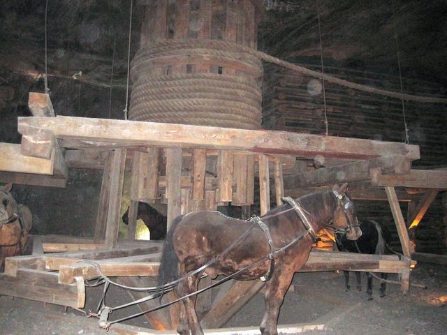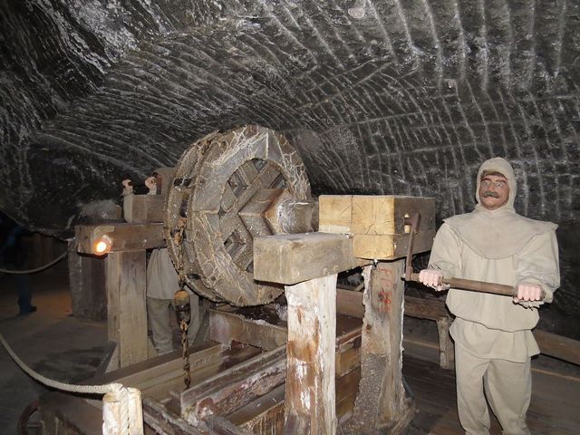 Ve výstavních prostorách se vedle oděvu horníků a nádherných krystalů soli dochovaly kladky, kladkostroje, páky, vozíky na vytěžené bloky tahané nejdříve lidmi, pak koňmi, nakonec po kolejích. Dech se nám úžil při pohledu na pohyblivou maketu výtahu, vlastně lana, které bylo používáno pro sestup do útrob temného dolu, kde číhala nejrůznější nebezpečí; uznáním neskrblili ti, kteří mají technickou představivost, když prozkoumávali rozměrné a důmyslné zařízení, o kterém nevím nic, než to, že ho bylo k úspěšnému dolování třeba… 🙂