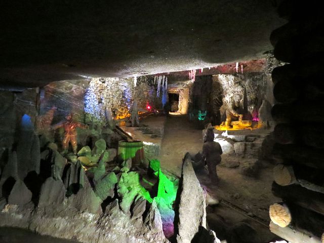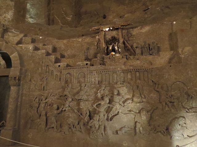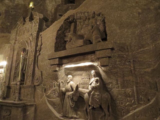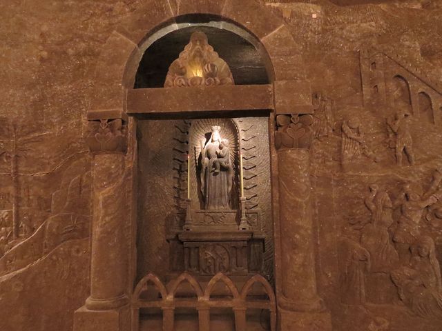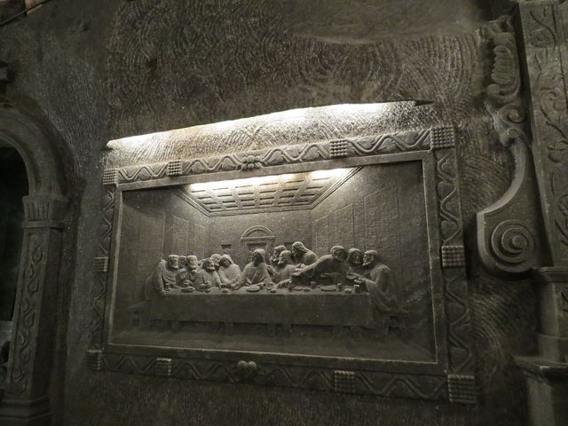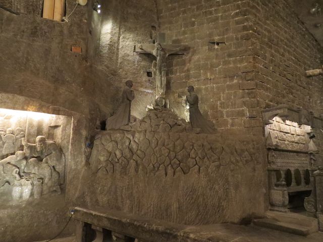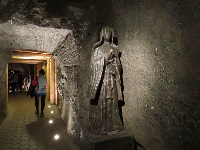 Během prohlídky jsme prošli tři patra, která jsou pro turistickou trasu zpřístupněna, po schodištích jsme krok za krokem sestoupili do hloubky 135 metrů (je psáno, že asi 800 schodů) a s údivem a obdivem procházeli klenuté síně, zastavovali se v kaplích, dýchali jódem obohacený vzduch stoupající z podzemních jezer s nasyceným solným roztokem (prý 34 dkg soli na l litr vody) – to vše rámováno sochami a reliéfy…