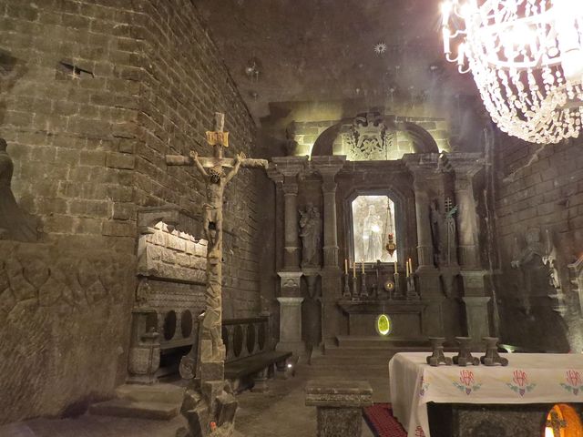 Zlatým hřebem prohlídky je pobyt v rozlehlé kapli sv. Kingy v hloubce 101 metrů pod zemí – při pohledu z galerie se nechce věřit, že všechna výzdoba, včetně lustrů je ze soli…
