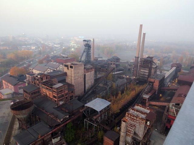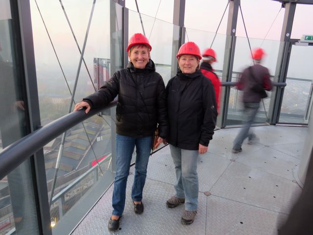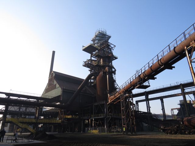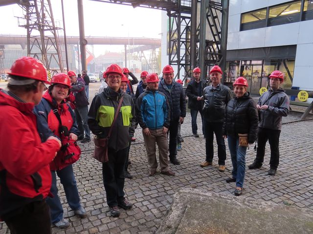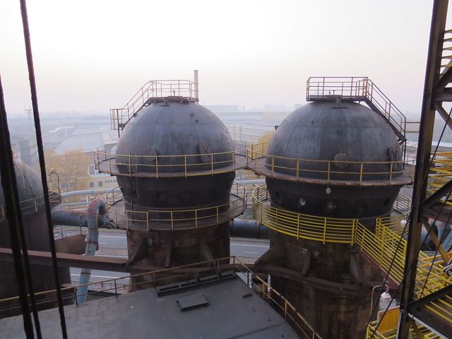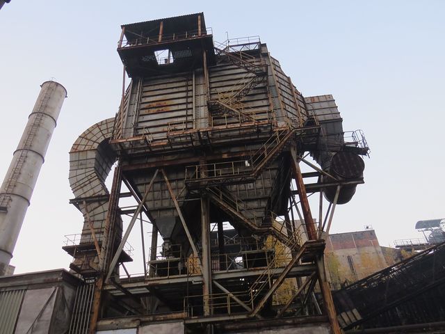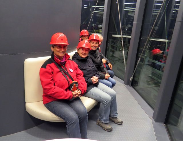 Po úvodních větách nás naložili do „skipového“ výtahu, který, jak nám vysvětlili, dříve vyvážel vozíky s rudou a koksem nahoru, tam se překlopil, aby materiál vysypal do žhnoucí pece – výtah nás vyvezl spolehlivě, výklopnou fázi naštěstí vynechal… Pak už jsme stoupali po bezpečných schodištích, ale daleké výhledy nám byly odepřeny, na krajinu pokrytou mlhou už navíc začínal padat soumrak…