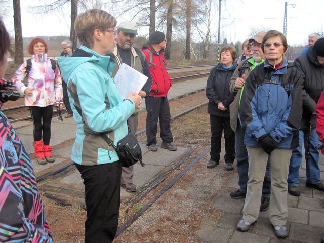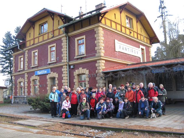 O jedenácté jsme byli na nádraží v Rantířově, kde vznikla obligátní fotografie účastníků, protože pak se už většinou všichni nesejdeme – každý volí rychlost a délku trasy, jaká mu vyhovuje – pak se Iva ujala slova a vysvětlila účastníkům program vycházky a případné varianty.