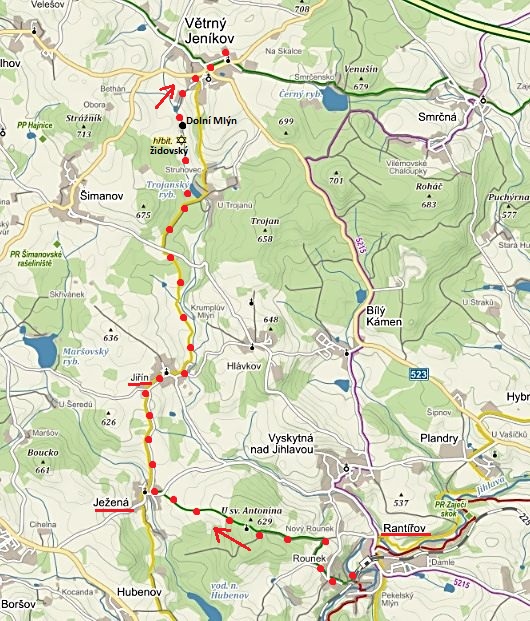 Rantířov ZTZ – Rounek – kaplička sv. Antonína – vrchol Hory Svatého Antonína – Šance – Ježená ŽTZ– Jiřín – Trojanský rybník – neznačenou cestou židovský hřbitov – Dolní mlýn – Větrný Jeníkov, pak od autobusu Jihlava – Bedřichov = celkem 17 km