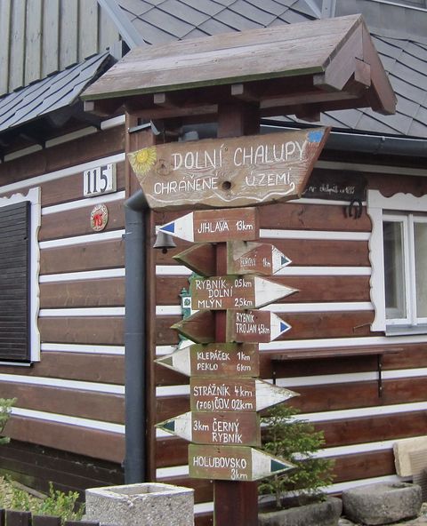 Větrný Jeníkov byl nedaleko na kopci, ke známé restauraci jsme stoupali pro nás novou cestou – z té zařazuji jen netradiční směrovník. 🙂